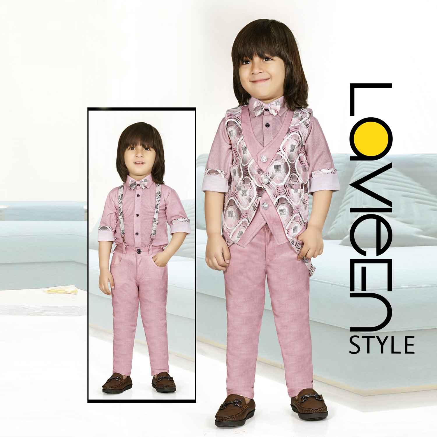 This adorable Boys' 3-Piece Party Wear Set from Cartoons – A Fashion Studio features a smart onion-pink shirt with matching pants, a printed waistcoat, and a cute bow tie. Perfect for festive occasions, weddings, and celebrations! 👔✨