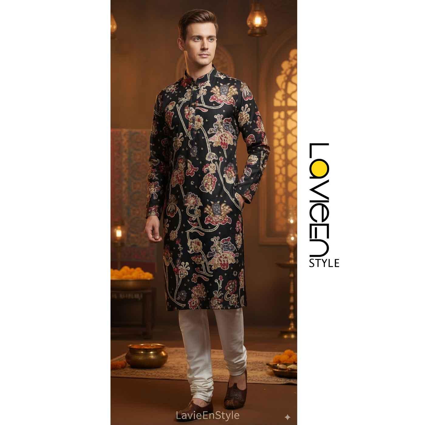 Adorned with a captivating floral print on a deep, sophisticated black, this kurta is a masterpiece of modern ethnic design. The luxurious modal cotton fabric ensures a fluid drape and exceptional comfort, making it ideal for any celebratory occasion or a stylish evening out. Step into the spotlight with LavieEnStyle.