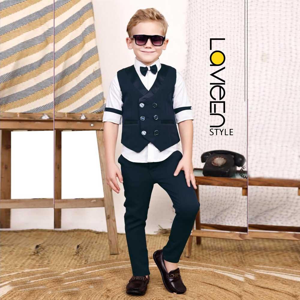 The outfit features a double-breasted black waistcoat with a unique diagonal button arrangement, paired with a crisp white shirt accented by modern black arm-band detailing. Completed with matching formal black trousers and a pre-tied bowtie, this set ensures your child is the best-dressed guest in the room.